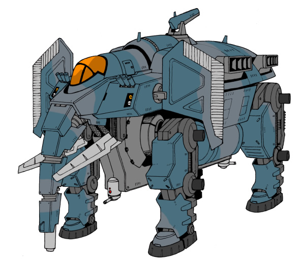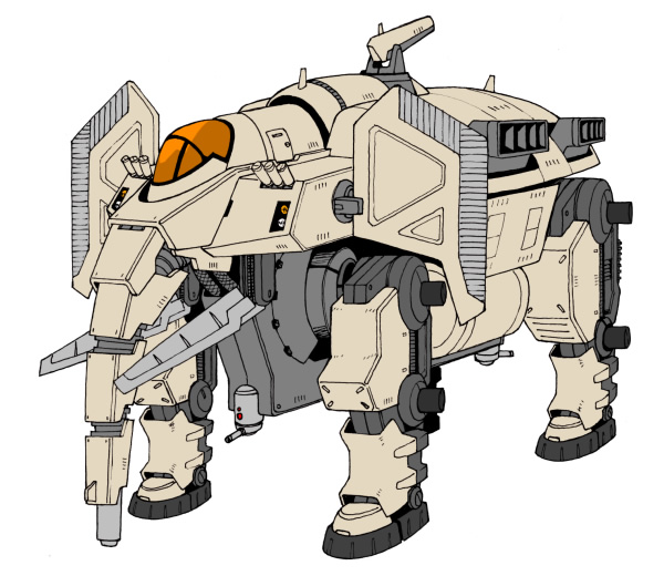 ゾウの鼻に相当する部位に展開式の荷電粒子砲を搭載し、優れたコア出力を利用して高い火力を得る仕組みとなっています。ちなみに、主砲の展開方法は、ラフスケッチを参照のこと。砲身をリトラクタブルにすることで、ロングバレルでありながらコンパクトに取り回しができるというメリットを狙っているわけですが、強度に若干の難を抱えていることも確か。